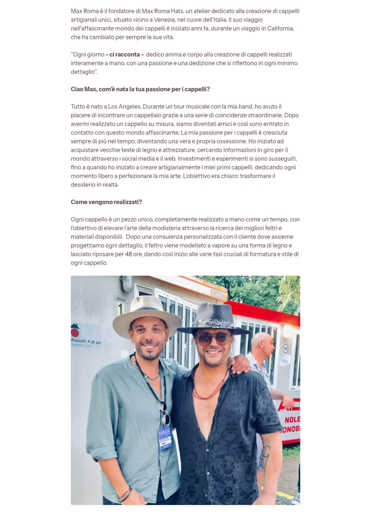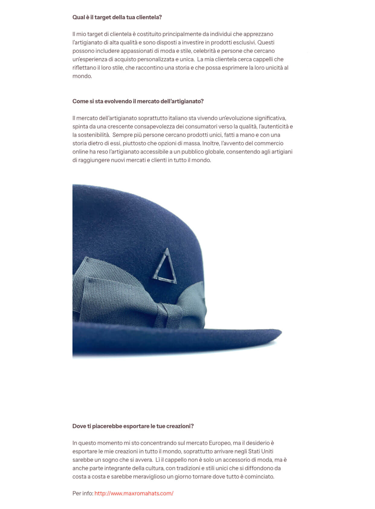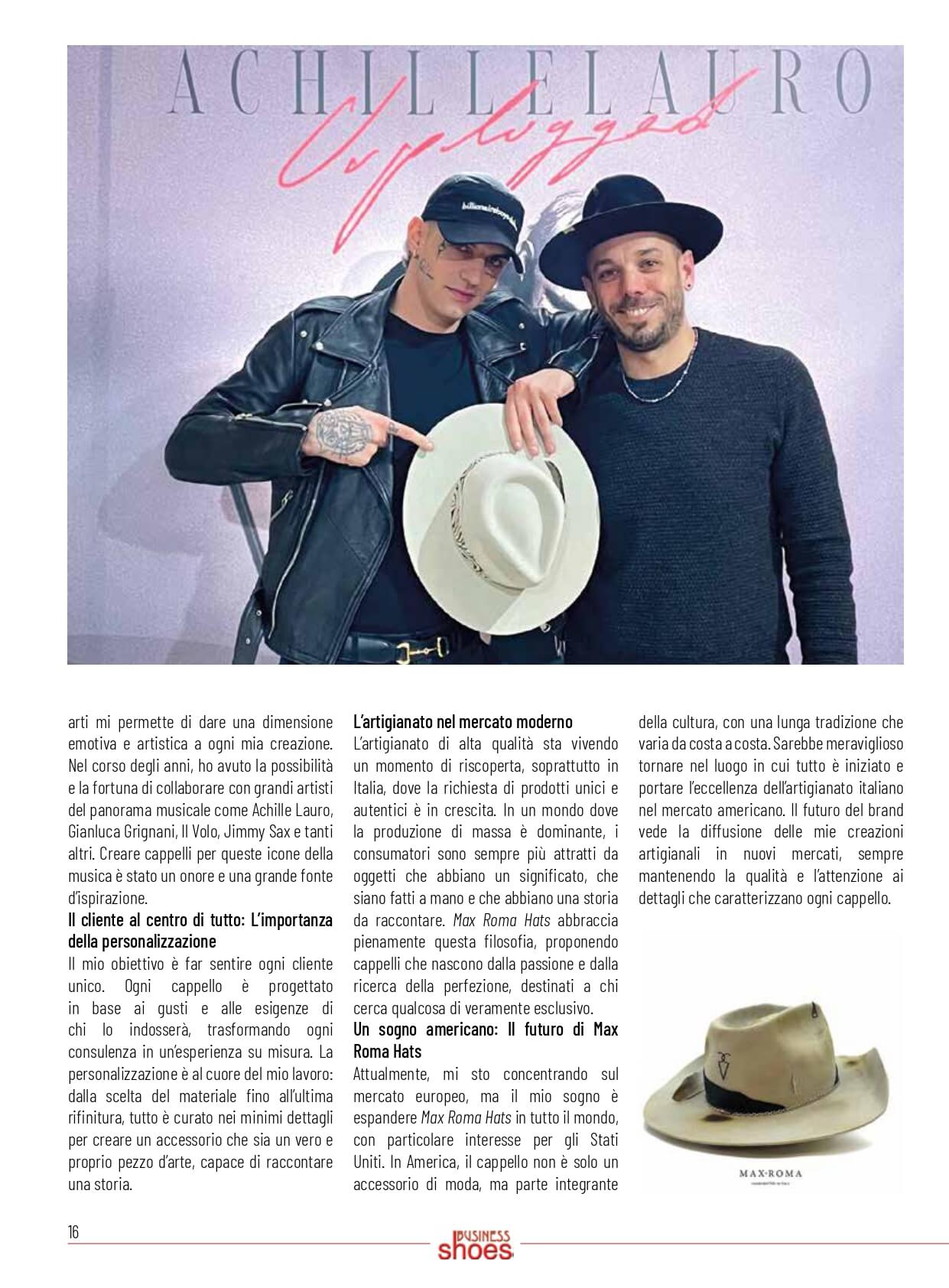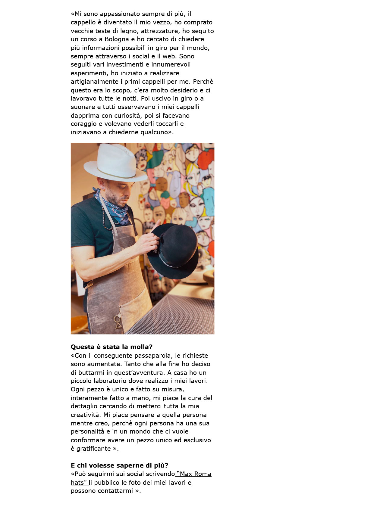 Ogni cappello racconta una storia, e dietro ogni storia c’è una passione che prende forma. In questa sezione troverai interviste, articoli e testimonianze che parlano di Max Roma Hats: il percorso, l’ispirazione e la dedizione che rendono ogni creazione unica. Sfoglia la raccolta e scopri cosa dicono di noi esperti del settore, artisti e appassionati di stile.